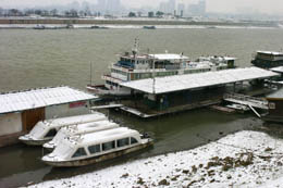 冰雪覆蓋下的長沙旅游客運(yùn)碼頭(1月15日攝)。 1月15日,受南下冷空氣影響,長沙普降大雪,多年不遇的冰凍天氣驟臨,市區(qū)內(nèi)交通嚴(yán)重受阻。截至記者發(fā)稿,長沙城內(nèi)所有公路立交橋及跨江大橋均出現(xiàn)冰凍,影響行人、車輛通行。目前,長沙市有關(guān)部門已啟動應(yīng)急搶險預(yù)案,做好防寒防凍工作,并加強(qiáng)警力疏導(dǎo),制訂保證主干道暢通的交通管制預(yù)案。據(jù)氣象部門預(yù)測,這種天氣大約將持續(xù)一周時間。 |