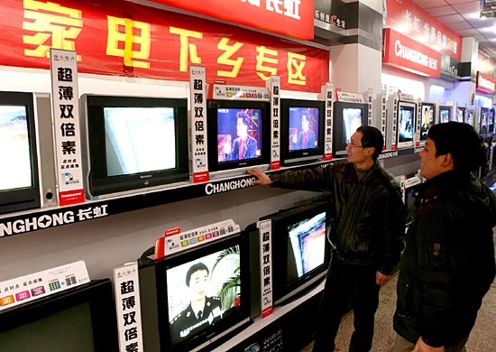 | 1月15日,四川省華鎣市雙河辦事處昭勛村的農(nóng)民在“家電下鄉(xiāng)”網(wǎng)點(diǎn)選購(gòu)彩電。近日,四川省啟動(dòng)“家電下鄉(xiāng)”試點(diǎn)工作。農(nóng)民購(gòu)買(mǎi)補(bǔ)貼范圍內(nèi)的彩電、冰箱、手機(jī)類產(chǎn)品,憑有效證件可到當(dāng)?shù)氐泥l(xiāng)鎮(zhèn)財(cái)政所申領(lǐng)“家電下鄉(xiāng)”補(bǔ)貼,標(biāo)準(zhǔn)為家電產(chǎn)品銷售價(jià)格的13%。 | |