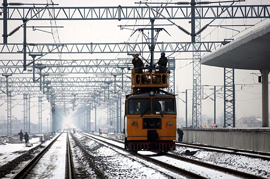 1月15日,中鐵四局冷滑機(jī)車在合寧高速鐵路上進(jìn)行電力接觸網(wǎng)測(cè)試。近日,中鐵四局對(duì)高鐵電力接觸網(wǎng)進(jìn)行通車前的不帶電“冷滑”和帶電的“熱滑”機(jī)車測(cè)試,以確保動(dòng)車組安全上線。