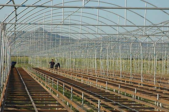 海南省積極探索,大力發(fā)展熱帶農(nóng)業(yè)。位于三亞崖城鎮(zhèn)的海源實(shí)業(yè)有限公司的果蔬基地,帶動(dòng)了200多戶農(nóng)民種植上萬(wàn)畝的綠色瓜菜,種子、農(nóng)藥、化肥使用既定產(chǎn)品。這里生產(chǎn)的綠色瓜菜大部分運(yùn)往港澳地區(qū)。圖為正在建設(shè)的三亞海源實(shí)業(yè)有限公司無(wú)土栽培大棚。