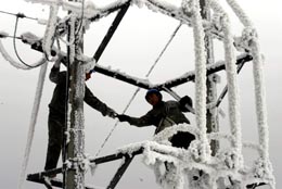 1月23日,電力工人搶修輸電線路。由于連續(xù)十多天出現(xiàn)冰凍天氣,湖北宜昌五峰縣山區(qū)供電設(shè)施遭到嚴(yán)重破壞。當(dāng)?shù)仉娏窘M織8支突擊搶修隊(duì)搶修線路,確保山區(qū)群眾用電。
