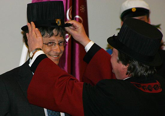 1月23日,在瑞典卡羅林斯卡醫(yī)學(xué)院舉行的儀式上,美國微軟公司董事長比爾·蓋茨戴上醫(yī)學(xué)榮譽博士帽?_林斯卡醫(yī)學(xué)院去年12月20日宣布,授予比爾·蓋茨及夫人梅林達(dá)·蓋茨醫(yī)學(xué)榮譽博士學(xué)位。