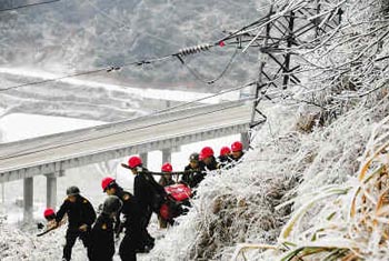 連日來,貴州電力部門每幢大樓的各個辦公室里,燈光徹夜通明;冰雪與濃霧覆蓋的大深山里,到處可見掛著“電力搶險”警示牌的工程車,艱難地穿行在鋪滿冰碴泥濘的山道上;風(fēng)雪中的鐵塔、電桿周圍,1.7萬多名工人奮戰(zhàn)在搶險一線。 風(fēng)大、雪大、霧大,交通中斷,給搶險工作增加了更大難度。在通往塔基的道路上,厚厚的覆冰像鏡面般光滑,搶修人員身負(fù)沉重?fù)屝薰て骶,鞋上捆綁著草繩,艱難地向現(xiàn)場挺進(jìn)。被凍的電桿無法攀登,他們就用稻草燃燒融冰,融一步登一步…… 面對這場幾十年不遇的冰雪災(zāi)難,省委號召全省上下萬眾一心,團(tuán)結(jié)奮戰(zhàn)。為支持電力部門搶險,貴州各地、州、市以及縣鄉(xiāng)的黨政機(jī)關(guān)和氣象、安監(jiān)、公安交警、醫(yī)療救護(hù)等部門,通力配合,共同制定應(yīng)對措施,把食品、藥品、木炭、衣被等送到搶修現(xiàn)場,做好后勤保障,盡快恢復(fù)當(dāng)?shù)厣睢⑸a(chǎn)用電。目前,不僅是電力工人,全省已組織機(jī)關(guān)干部職工、武警、消防官兵以及青年志愿者等數(shù)十萬人,奔赴各事故現(xiàn)場,與當(dāng)?shù)厝罕娨黄,抗冰救?zāi)。