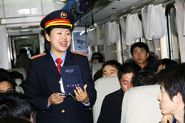 1月31日凌晨,列車長(zhǎng)在車廂內(nèi)向旅客介紹停車時(shí)的安全事項(xiàng)。 當(dāng)日6時(shí)許,往返于沈陽(yáng)和廣州間、因暴風(fēng)雪晚點(diǎn)近80個(gè)小時(shí)的T12/T14次列車在經(jīng)過了6天6夜的艱難旅程后,安全返回沈陽(yáng)北站。面對(duì)幾十年不遇的冰雪災(zāi)害,沈陽(yáng)鐵路局沈陽(yáng)客運(yùn)段T12/T14次“三八乘務(wù)組”的64名女乘務(wù)員以頑強(qiáng)的意志和耐心細(xì)致的服務(wù)克服了列車嚴(yán)重超員、食品飲用水缺乏等諸多困難,贏得了旅客的理解和支持,與3000多名旅客一起平安返回家園。 |