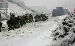 2月3日,武警官兵在京珠高速公路湖南段鏟雪。 經(jīng)過(guò)解放軍和武警官兵連續(xù)幾天持續(xù)不斷地破冰鏟雪,京珠高速公路湖南段于當(dāng)日15時(shí)40分基本貫通。 為盡快打通京珠大動(dòng)脈,武警駐湖南某部出動(dòng)了1200多名官兵日夜奮戰(zhàn)在京珠高速公路破冰鏟雪、維持交通秩序。廣州軍區(qū)某部出動(dòng)3臺(tái)裝甲牽引車(chē)和2臺(tái)故障搶修車(chē),在高速公路冰凍層最厚的地段輾冰除雪。 |