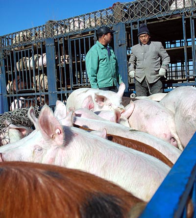 2月27日,吉林省農(nóng)安縣生豬運銷大戶正在裝車。我國商品糧大省吉林省發(fā)揮產(chǎn)糧大省優(yōu)勢,大力發(fā)展養(yǎng)豬業(yè)。2007年全省生豬飼養(yǎng)達到3600萬頭,比上年增長11%;出欄2200萬頭,存欄1400萬頭,比上年增長16.67%。其中活豬外銷量達到800多萬頭,400多萬頭制成肉制品銷往省外。