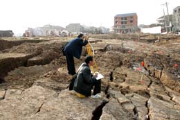 3月1日,監(jiān)測人員在地陷現(xiàn)場進(jìn)行勘測。從2月29日下午開始,武漢長江干堤附近一在建小區(qū)內(nèi)發(fā)生大面積地表塌陷。這一地表塌陷災(zāi)害發(fā)生在離長江干堤100余米處,沿長江干堤形成了一條近300米長的地陷帶。地陷中心形成了長約105米、寬達(dá)47米、最深處約6米的坑道。