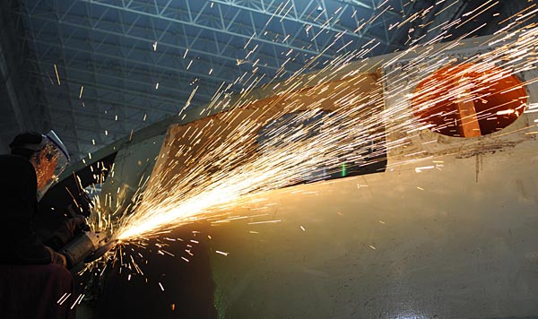 一名建設者在打磨三峽右岸電站19號水輪發(fā)電機組的機組頂蓋(3月5日攝)。