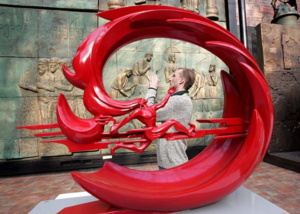 2008奧運(yùn)景觀雕塑方案征集大賽及國(guó)際巡展莫斯科站日前開幕,數(shù)十件以2008奧運(yùn)為主題的雕塑作品與觀眾見面。圖為一名俄羅斯觀眾在莫斯科“采烈捷利藝術(shù)畫廊”拍攝參展的奧運(yùn)題材雕塑作品。