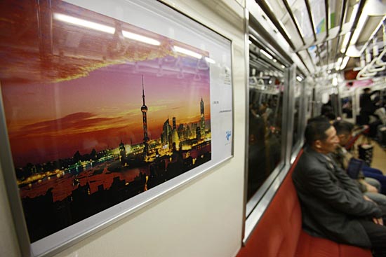 25日,日本東京市民在市內(nèi)乘坐“上海世博號”列車。當(dāng)日,四輛裝飾有2010年上海世博會會標(biāo)和吉祥物圖案的“上海世博號”列車開始在東京四條交通干線上行駛,列車上還展出了1280幅圖片,將在為期一個月的時間里流動展示上海及上海世博會。