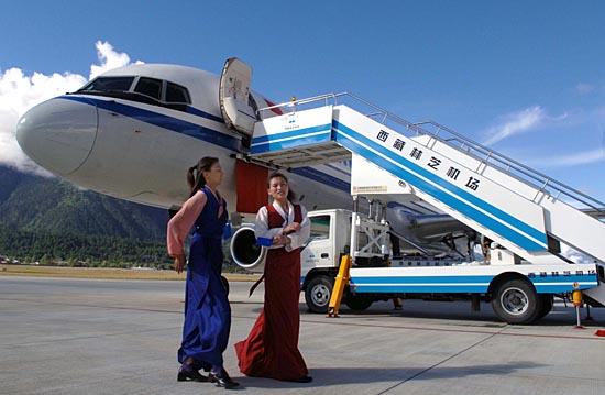2006年9月1日,兩名藏族少女從停在西藏林芝機(jī)場的一架飛機(jī)前經(jīng)過。 最新統(tǒng)計(jì)顯示:2007年西藏自治區(qū)生產(chǎn)總值超過342億元,人均GDP超過1.2萬元,按可比口徑計(jì)算均比2002年翻了近一番,西藏經(jīng)濟(jì)實(shí)現(xiàn)了連續(xù)7年保持12%以上的增速跨越發(fā)展。
