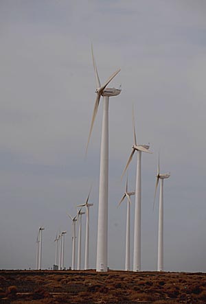 隨著酒泉市1000萬千瓦級(jí)風(fēng)電基地建設(shè)項(xiàng)目日前獲國家發(fā)改委批準(zhǔn)并立項(xiàng)建設(shè),甘肅省在河西走廊打造“風(fēng)電走廊”的設(shè)想正在一步步變成現(xiàn)實(shí)。專家分析,甘肅省有望在今后10年內(nèi)成為全國最大的風(fēng)能產(chǎn)業(yè)帶。圖為甘肅省酒泉市號(hào)稱“世界風(fēng)庫”的瓜州縣縣城附近的一處風(fēng)電基地。