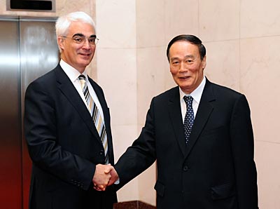 4月15日,首次中英經(jīng)濟(jì)財(cái)金對(duì)話在北京舉行。國(guó)務(wù)院總理溫家寶的特別代表、國(guó)務(wù)院副總理王岐山和英國(guó)首相布朗的特別代表、財(cái)政大臣達(dá)林共同主持對(duì)話,兩國(guó)經(jīng)濟(jì)、財(cái)政、金融、貿(mào)易、外交等部門(mén)負(fù)責(zé)人與會(huì)。這是對(duì)話開(kāi)始前,王岐山與達(dá)林握手。 | |