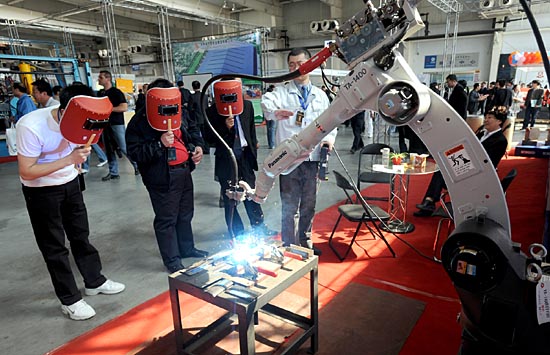 4月17日,日本松下公司展出的一款工業(yè)通用機器人吸引不少參觀者。當日,首屆中國長春制造業(yè)博覽會在長春國際會展中心拉開帷幕,來自海內(nèi)外的360家企業(yè)匯聚長春,展出自己的主打產(chǎn)品。