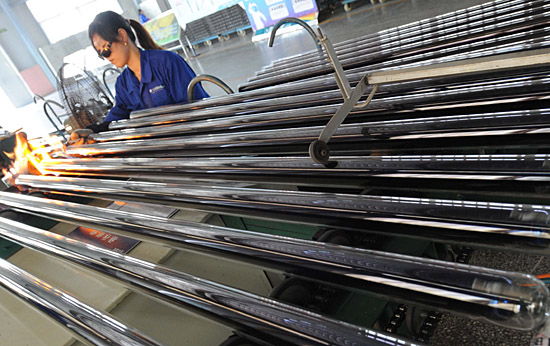 5月7日,工人在加工太陽能全玻璃真空集熱管。 江蘇省太陽雨太陽能有限公司著眼于企業(yè)的創(chuàng)新發(fā)展能力,與國內(nèi)多家大學及科研院所建立合作關(guān)系,承擔起多項國家火炬計劃項目,研發(fā)并擁有了100多項擁有自主知識產(chǎn)權(quán)的產(chǎn)品。目前該企業(yè)已經(jīng)連續(xù)四年成為中國重要的太陽能熱水器出口制造基地,產(chǎn)品遠銷全球70多個國家和地區(qū)。 | |