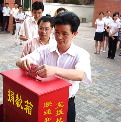 5月14日,中國聯(lián)通漳州分公司舉行了向“四川汶川地震”災(zāi)區(qū)捐款活動,當(dāng)天共收到員工捐款78250元。同時(shí),該公司還在四川籍外來工集中的工作區(qū)、生活區(qū)免費(fèi)發(fā)送關(guān)于地震的最新動態(tài)消息,并現(xiàn)場擺放免費(fèi)無線電話。同時(shí)倡議廣大聯(lián)通客戶將積分兌換成現(xiàn)金捐贈給災(zāi)區(qū)人民。 | |