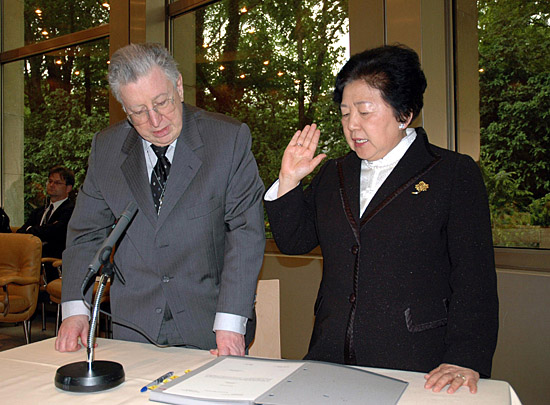 20日,中國律師張月姣(右)在日內(nèi)瓦世界貿(mào)易組織總部宣誓,正式就任世貿(mào)組織上訴機構(gòu)法官。上訴機構(gòu)是世貿(mào)組織負責(zé)貿(mào)易爭端裁決的最高機構(gòu),由7名法官組成。這是中國內(nèi)地律師首次在世貿(mào)組織中擔(dān)任這一重要職務(wù)。