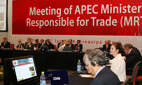 | 5月31日,第14屆亞太經(jīng)濟(jì)合作組織貿(mào)易部長會(huì)議在秘魯南部阿雷基帕省首府阿雷基帕開幕。亞太經(jīng)合組織21個(gè)經(jīng)濟(jì)體的貿(mào)易部長或其他高級官員以及世界貿(mào)易組織的代表共200多人出席了會(huì)議。由商務(wù)部部長陳德銘率領(lǐng)的中國代表團(tuán)也出席了會(huì)議。新華社發(fā) | |