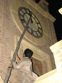 日前,巴基斯坦全國調(diào)整時間,將時鐘撥快一小時,商店也提早關(guān)門。政府采取這一舉措,是為了節(jié)約用電,以應(yīng)對嚴重的電力短缺。圖為在巴基斯坦的海得拉巴,一名男子用竹竿調(diào)整鐘樓上時鐘的指針。