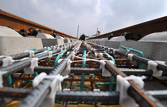 6月19日,施工人員在武廣客運專線調(diào)試試驗鐵路枕軌。 武(漢)廣(州)客運專線是中國鐵路建設(shè)史上新的里程碑工程,也是國家“十一五”規(guī)劃重點工程。武廣客運專線2005年開工,設(shè)計時速為350公里,它將連接湖北、湖南、廣東三省,是華中、華南的又一重要通道。作為當(dāng)時我國開工建設(shè)第一條里程最長、投資最多、技術(shù)標(biāo)準(zhǔn)最高的鐵路客運專線,武廣客運專線主要應(yīng)用了板式和雙塊式無砟軌道,具有技術(shù)新、標(biāo)準(zhǔn)高、工程龐大、系統(tǒng)復(fù)雜等特點。 | |