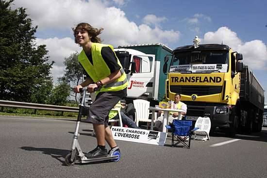 6月30日,在法國北部的法朗潘,一名少年蹬著滑板車從堵塞公路的卡車旁經(jīng)過。當(dāng)天,法國大批卡車司機(jī)在法國多個城市以堵塞道路的方式抗議油價上漲,并要求政府支持運輸行業(yè)。新華社/路透