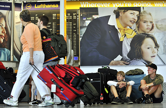 7月1日,在德國法蘭克福國際機場,兩名乘客席地而坐等待航班信息。