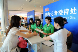 2008北京國際新聞中心工作人員為記者服務(wù)。