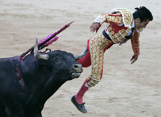 13日,在西班牙潘普洛納奔牛節(jié)上,一名西班牙斗牛士在斗;顒(dòng)中被牛角挑起。新華社/路透