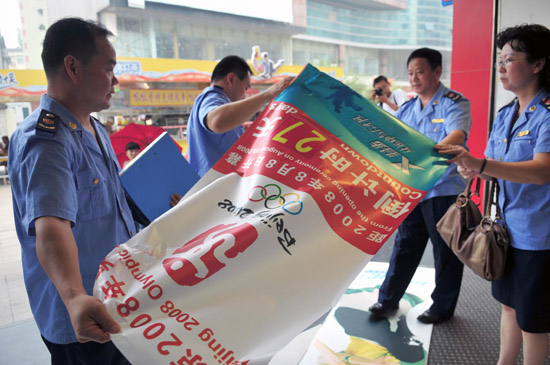 [進(jìn)入北京奧運(yùn)會(huì)專題] 7月14日,合肥市廬陽區(qū)工商局執(zhí)法人員對(duì)轄區(qū)進(jìn)行“拉網(wǎng)式”檢查,開展保護(hù)奧林匹克標(biāo)志專有權(quán)專項(xiàng)行動(dòng),重點(diǎn)查處商家未經(jīng)許可、擅自使用奧運(yùn)標(biāo)志的行為。