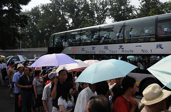 7月20日,乘客在觀光專線的北官?gòu)d站排起長(zhǎng)隊(duì)等待乘車。當(dāng)日,北京開通兩條奧運(yùn)觀光專線,供國(guó)內(nèi)外游客奧運(yùn)期間游覽奧運(yùn)場(chǎng)館和北京市內(nèi)的名勝景點(diǎn)。