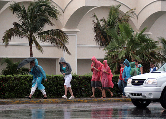21日,旅游者冒雨行走在墨西哥度假旅游勝地坎昆的旅館區(qū)大街上。當日,熱帶風暴“多莉”經(jīng)過墨西哥金塔納羅州的坎昆,但沒有給該地區(qū)造成嚴重損失。