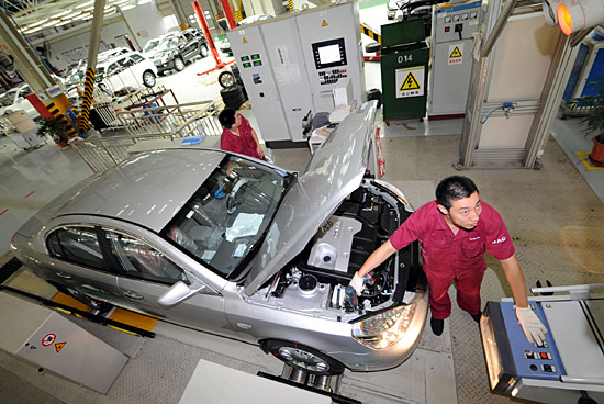 | 7月23日,兩名工人在江淮轎車生產(chǎn)基地總裝車間對(duì)一臺(tái)即將下線的賓悅轎車進(jìn)行檢測(cè)。據(jù)中國(guó)汽車工業(yè)協(xié)會(huì)統(tǒng)計(jì),今年上半年國(guó)產(chǎn)汽車產(chǎn)銷分別為519.96萬(wàn)輛和518.22萬(wàn)輛,同比分別增長(zhǎng)16.71%和18.52%。 | |