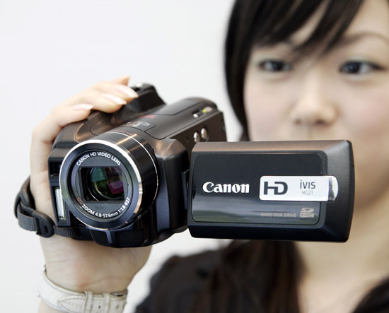 7日,在日本東京佳能公司總部,工作人員展示佳能新推出的高清數(shù)字便攜式攝像機(jī)“iVIS HG21”。這款攝像機(jī)內(nèi)置330萬(wàn)像素的圖像傳感器和120G容量的硬盤,最長(zhǎng)可以錄制45小時(shí)的高清視頻圖像。佳能公司計(jì)劃本月將這款攝像機(jī)投放市場(chǎng)。新華社/法新