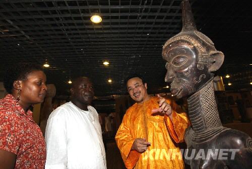 8月9日,參觀者在展覽上觀看非洲木雕藝術作品。當日,非洲古文明展《遠古的凝視》在北京橋藝術中心開展,共展出非洲木雕、象牙雕,陶塑、織品和皮革藝術等300余件非洲古代藝術品。