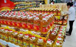 8月14日,銀川市某商場(chǎng)的工作人員在擺放食用油。據(jù)新華社全國農(nóng)副產(chǎn)品和農(nóng)資價(jià)格行情系統(tǒng)監(jiān)測(cè),7月以來,食用油價(jià)格整體回落。
