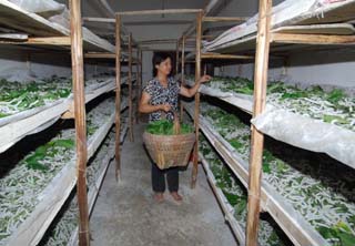 江西萬年大力發(fā)展蠶桑產(chǎn)業(yè)。目前全縣桑園面積已發(fā)展到9000畝,養(yǎng)蠶農(nóng)戶達(dá)7000多戶,并全部實(shí)現(xiàn)手持訂單生產(chǎn)。8月30日,上坊鄉(xiāng)港邊村技術(shù)工人郝國珍在喂養(yǎng)桑蠶。新華社發(fā)(周科