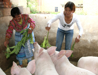 云南開遠(yuǎn)養(yǎng)豬戶母豬領(lǐng)“補(bǔ)貼”。圖為樹木克上寨村彝族養(yǎng)豬戶周華清(右1)在給喂食快出欄的架子豬在政府補(bǔ)助下,她家養(yǎng)豬年獲益4萬多元。新華社記者