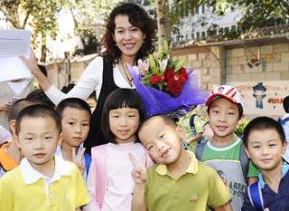 9月10日,在北京第二實(shí)驗(yàn)小學(xué),一名一年級老師手持鮮花在拜師會后被學(xué)生簇?fù)。?dāng)日,該校在一年一度的教師節(jié)之際舉行拜師會,一年級新生正式向任課老師行拜師禮。