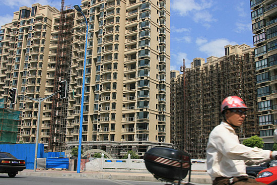 一位上海市民騎車從上海中心城區(qū)某新建商品樓前經(jīng)過(9月9日攝)。上海佑威房地產(chǎn)研究中心9月10日發(fā)布的最新報告顯示,2008年上海樓市調(diào)整過程中,已有44.8%的新樓盤平均成交價格出現(xiàn)下跌。