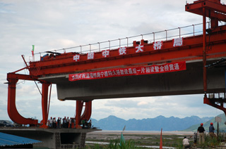 9月15日,由中鐵大橋局承建的溫福鐵路寧德特大橋的最后一片預(yù)制箱梁正在架設(shè)中。 當日,全長約8169米的跨海鐵路大橋——溫福鐵路寧德特大橋順利貫通,為溫福鐵路按期鋪軌創(chuàng)造了條件。溫福鐵路寧德特大橋于2005年9月開建,有5000多米長的橋梁跨海,建設(shè)難度大。溫福鐵路是我國鐵路中長期規(guī)劃“八縱八橫”主通道沿?焖勹F路的重要組成部分,與福(州)廈(門)和廈(門)深(圳)兩條沿?焖勹F路相連后,將成為從長三角經(jīng)福建到珠三角的最便捷通道。 |