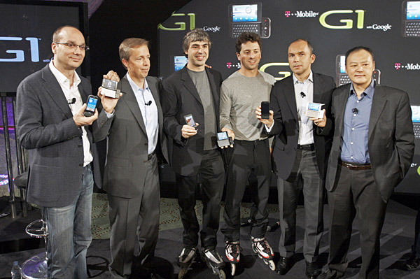 | 23日,在美國紐約,來自谷歌、德國電信和旗下移動服務(wù)提供商T-Mobile以及生產(chǎn)商臺灣宏達(dá)電的高層人員一同展示首款谷歌Android操作系統(tǒng)智能手機T-Mobile