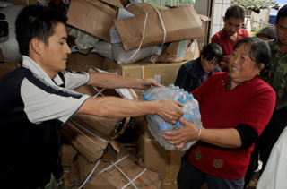9月25日,群眾在北川縣任家坪村領(lǐng)取飲用水。由于連日降雨,四川省北川縣許多地方遭遇泥石流襲擊。當(dāng)?shù)卣o急轉(zhuǎn)移受災(zāi)群眾,并向他們提供食物、飲用水、帳篷等物資。