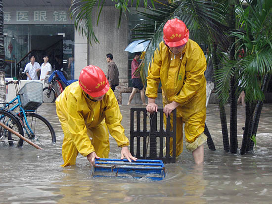 10月14日,兩名市政工人在?谑旋堌S路口疏通下水管道并設(shè)置標識,以防行人不慎跌入。