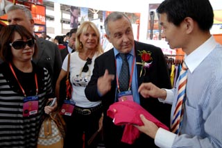 10月21日,中國義烏浪莎企業(yè)的營銷人員正在向意大利商人推薦新產(chǎn)品。