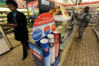 20日,在美國首都華盛頓國會(huì)山,印有美國民主黨總統(tǒng)候選人奧巴馬和共和黨總統(tǒng)候選人麥凱恩名字的一次性紙杯被擺放在一家7-11便利店里。顧客可以根據(jù)自己的傾向選擇其一盛取咖啡。當(dāng)天,印有奧巴馬名字的紙杯在這場全國范圍內(nèi)舉行的“咖啡杯競賽”中以60%的“支持率”居領(lǐng)先地位。