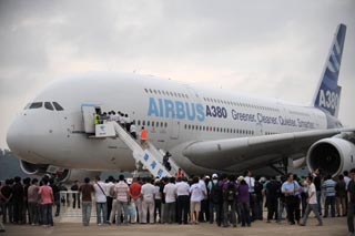 11月3日,世界最大客機——被稱為“空中巨無霸”的空客A380客機飛抵珠海機場。從11月4日開始,這架客機將在第7屆中國國際航空航天博覽會(珠海航展)上進行靜態(tài)展示及飛行表演。這是空中客車A380客機首次參加珠海航展。