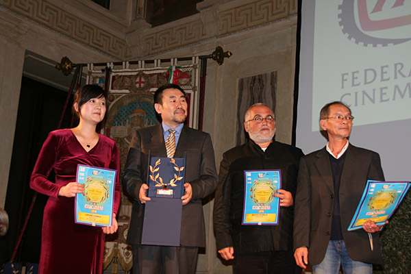 5日,中央新聞紀錄電影制片廠廠長高峰(左二)與影片導演顧筠(左一)在頒獎現(xiàn)場。當日,第26屆國際體育電影電視周在意大利米蘭落幕。由北京奧組委新聞宣傳部監(jiān)制、中央新聞紀錄電影制片廠拍攝制作的奧運紀實電影《筑夢2008》,獲本屆電視周的報道紀錄片單元的最佳影片“榮譽花環(huán)”獎和特別獎項中的影評獎。新華社發(fā)