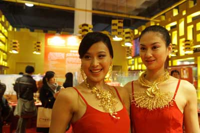 11月11日,模特在展廳內(nèi)展示黃金飾品。