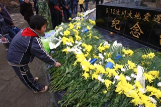 11月12日,一名學生在青川東河口地震遺址公園向遇難者獻花。