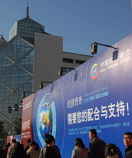 豎立在北京西單街頭有關(guān)第二次全國經(jīng)濟(jì)普查的大型宣傳牌引人注目(11月15日拍攝)。 第二次全國經(jīng)濟(jì)普查的對象是在中國境內(nèi)從事第二產(chǎn)業(yè)和第三產(chǎn)業(yè)的所有法人單位、產(chǎn)業(yè)活動(dòng)單位和個(gè)體經(jīng)營戶。普查的標(biāo)準(zhǔn)時(shí)點(diǎn)是2008年12月31日,時(shí)期資料為2008年度。 | |